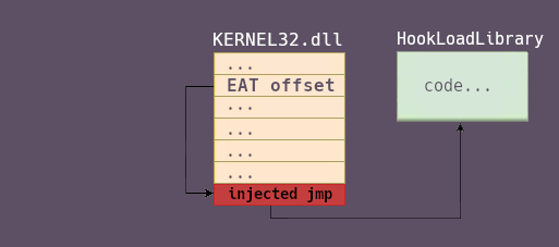 The solution to this is to ask Windows to allocate us a small chunk of memory the closest possible to kernel32 and to write to it a single jmp <address of our function>. We then will be able to make the EAT points to it, which will redirect any calls to our function.