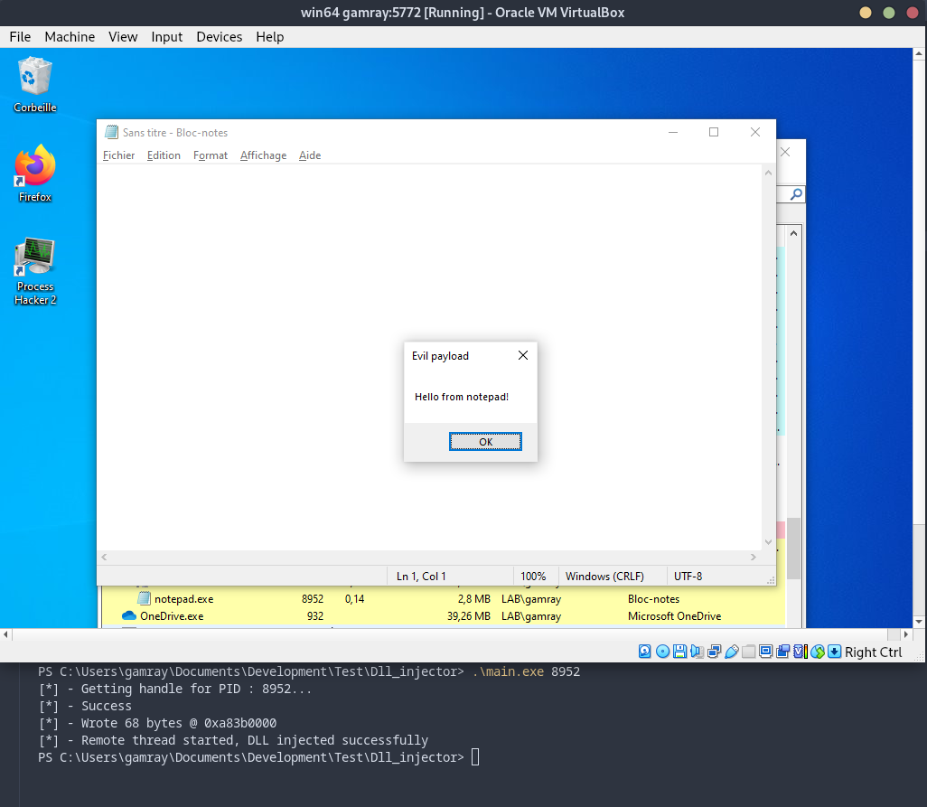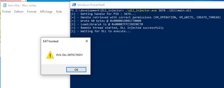 And… it’s a success, the dll injector made notepad execute our own LoadLibraryA and can’t inject the evil dll ! ๐ฅณ