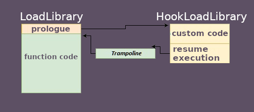 The process is simple, we dynamically change the code of the target function, in order to jump to our custom hook when the function is called. Once our hook has been executed, we jump to a “trampoline”, that simply executes the stolen bytes of the original function before jumping back to it.