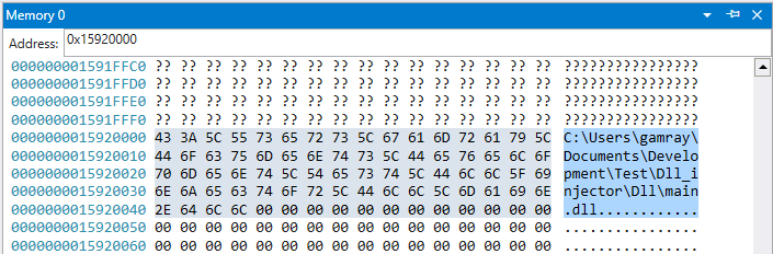 If we now run our program, we’ll see the address that our DLL path has been wrote: