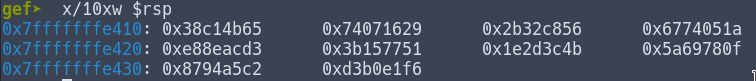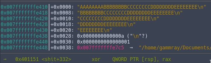 Une fois nos 5 parties xorés, le code va remettre rsp à sa valeur initiale avec sub rsp, 0x28 0x28 = 40, rsp pointe donc à nouveau vers le début de notre input, sauf que notre input n’est plus “AAAAAAAABBBBBBBBCCCCCCCCDDDDDDDDEEEEEEEE”, mais: