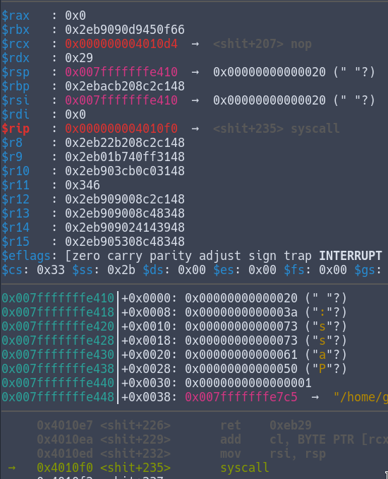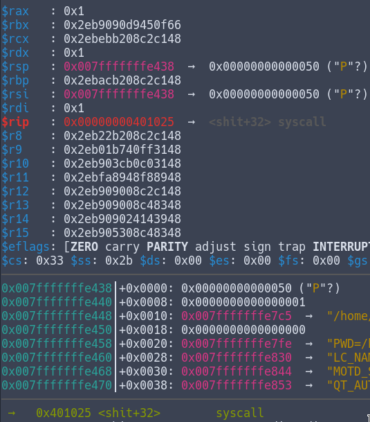En continuant d’avancer dans le code, on voit que les registres sont changés et on finit par tomber sur une instruction syscall.