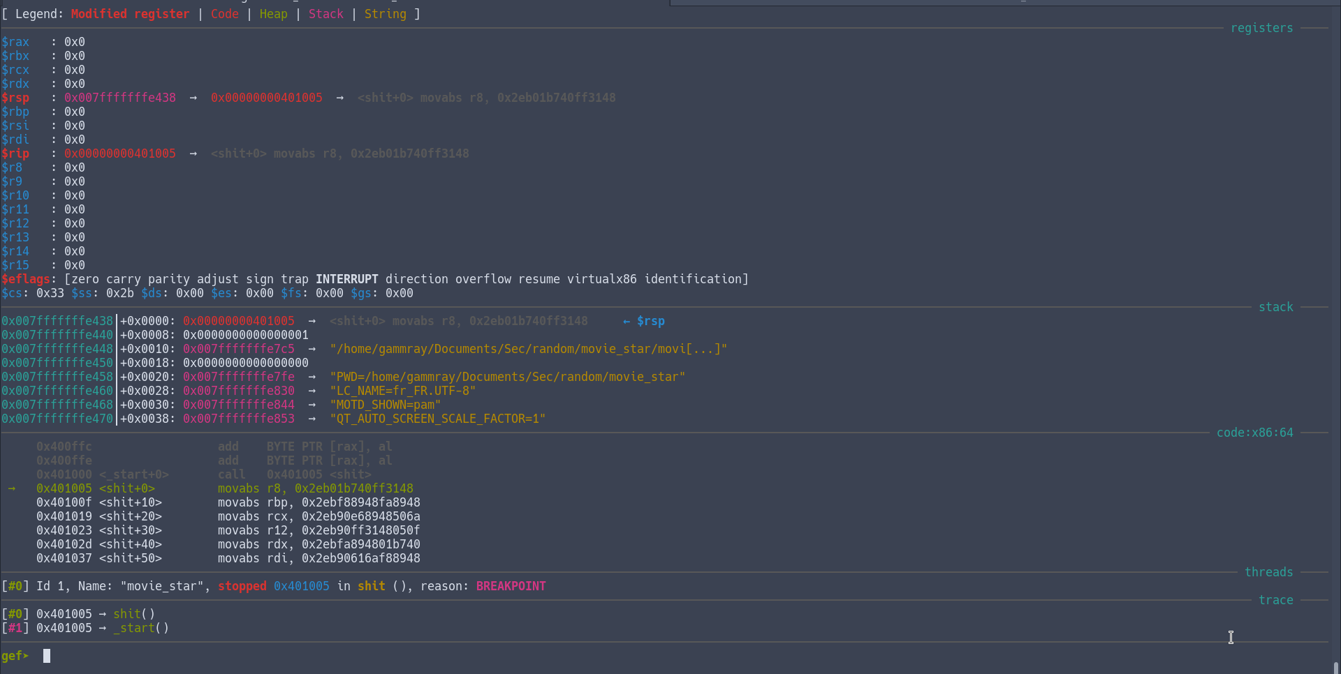 On ouvre gdb, petit breakpoint à shit et on lance le tout. ( J’utilise le plugin gef )