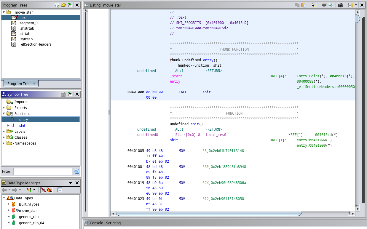 En ouvrant le binaire dans ghidra, voici ce qu’on voit