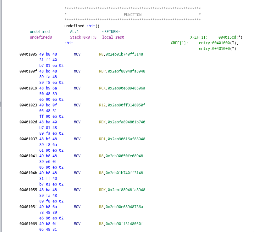 Eeet… on tombe sur une centaine de lignes similaires à celles-ci. évidemment, c’est illisible et incompréhensible, donc mon premier réflexe a été d’abandonner l’analyse statique et de passer directement à l’analyse dynamique ( parce que je suspecte du code polymorphe, donc qui se modifie au runtime ).