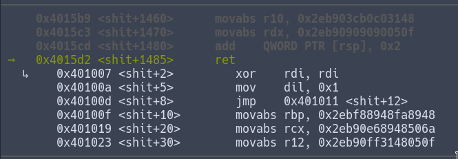 On retrouve toutes nos instructions movabs qu’on avait vues dans ghidra. A priori, movabs ça sert juste à déplacer des données, donc y’a forcément autre chose même si on le voit pas encore. Du coup, on spamme de ni pour aller jusqu’à la fin de la fonction.