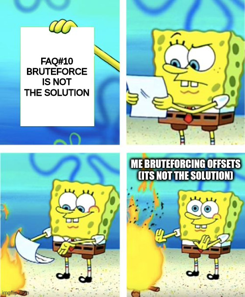 At some point I did a little script that dumped every single byte I could read before the program crashes (if we try to read somewhere memory isnt mapped, it will crash) but I did not find anything interesting at first.