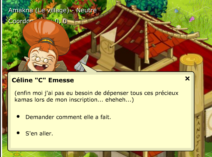 The description of the challenge told us to meet “Céline ‘C’ Emesse” - CMS - in Amakna (0,0). When we reached her (it’s a long way), she tells us that she managed to became a VIP during registration without using kamas: